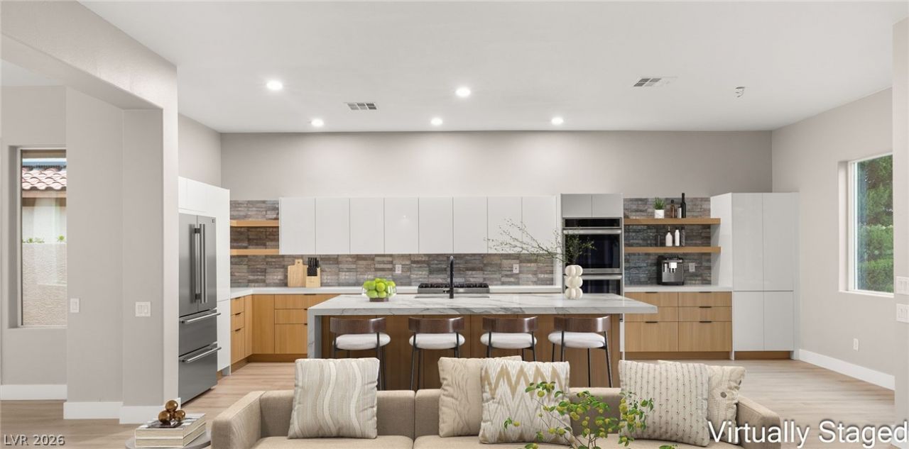 Beautifully remodeled single-story in the heart of Summerlin, designed for effortless living and entertaining. Extensive upgrades include fresh interior paint, brand-new flooring, and a fully renovated kitchen and baths. High ceilings and abundant natural light highlight the open-concept layout, while a new 10'x12' stacking glass door transforms the great room into a true indoor-outdoor experience. The chef's kitchen features new stainless steel appliances, custom cabinetry, designer backsplash, modern fixtures, and stunning countertops with a dramatic waterfall island. The spacious primary suite offers a spa-like retreat with soaking tub, walk-in shower, and dual vanities. Step outside to your private backyard oasis with stamped concrete patio, sparkling pool, and relaxing spa with waterfall?perfect for enjoying Las Vegas days and nights. Turnkey Summerlin living close to shopping, dining, and recreation.